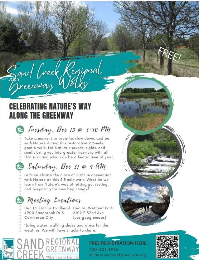 Guided Winter Walk on The Greenway Tuesday, December 13, 2022 3:30 PM 4:30 PM 4900 Sandcreek Drive South Commerce City, CO, 80022 United States (map) Google Calendar ICS Take a moment to breathe, slow down, and be with Nature during this restorative 2.2-mile gentle walk. Let Nature's sounds, sights, and smells bring you into greater harmony with all that is during what can be a hectic time of year. Register Here