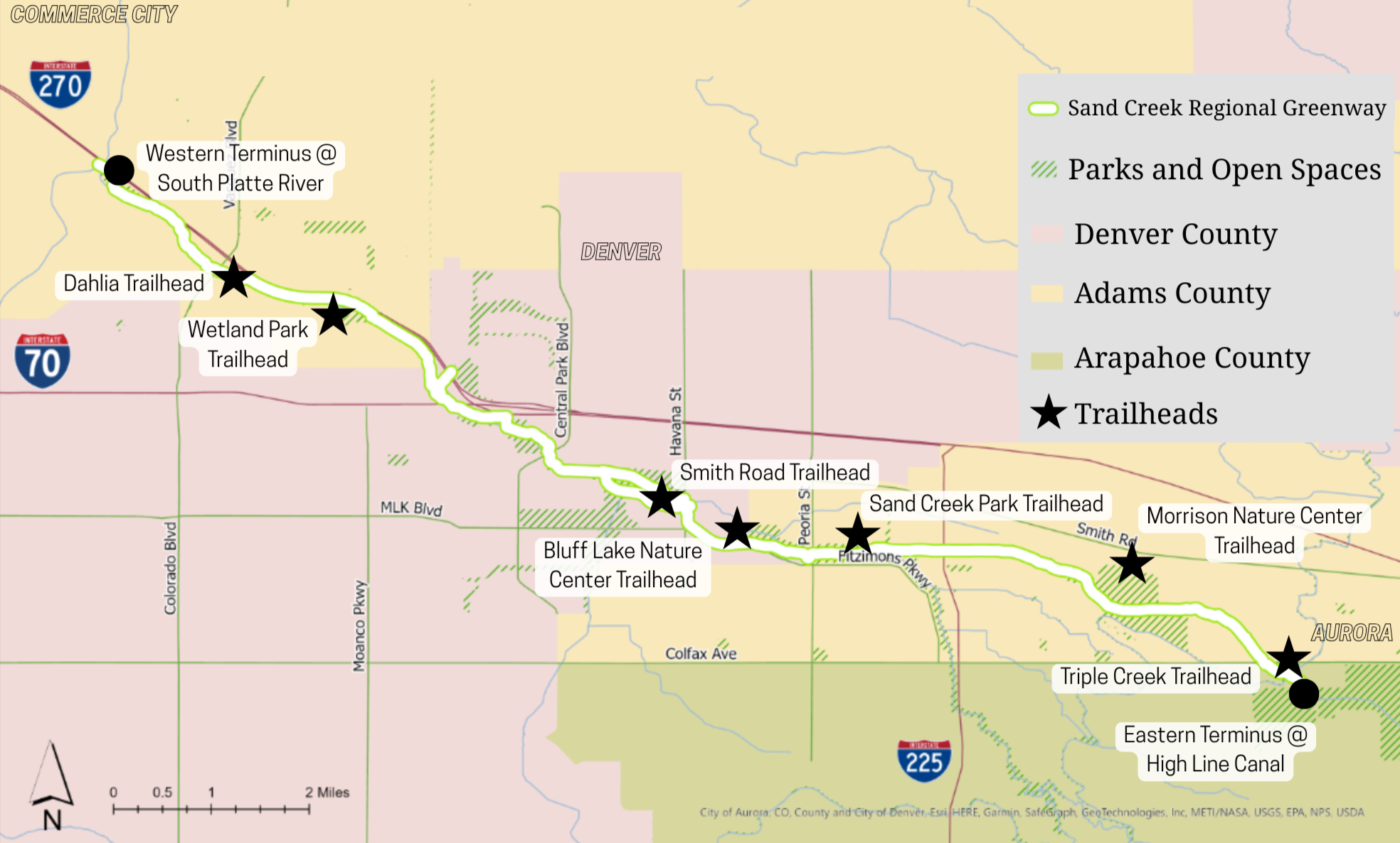 The Sand Creek Regional Greenway is 13-miles, connecting Commerce City, Denver, and Aurora. You can use this detailed trail map to find our seven (7) trailheads, various access points, and different destinations and amenities along the trail. Please note this map does not reflect possible detours and construction on the trail.